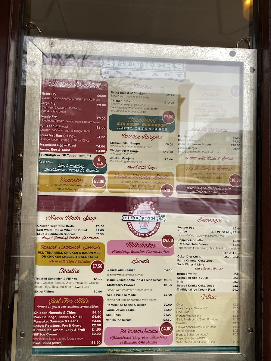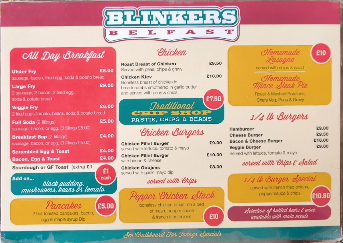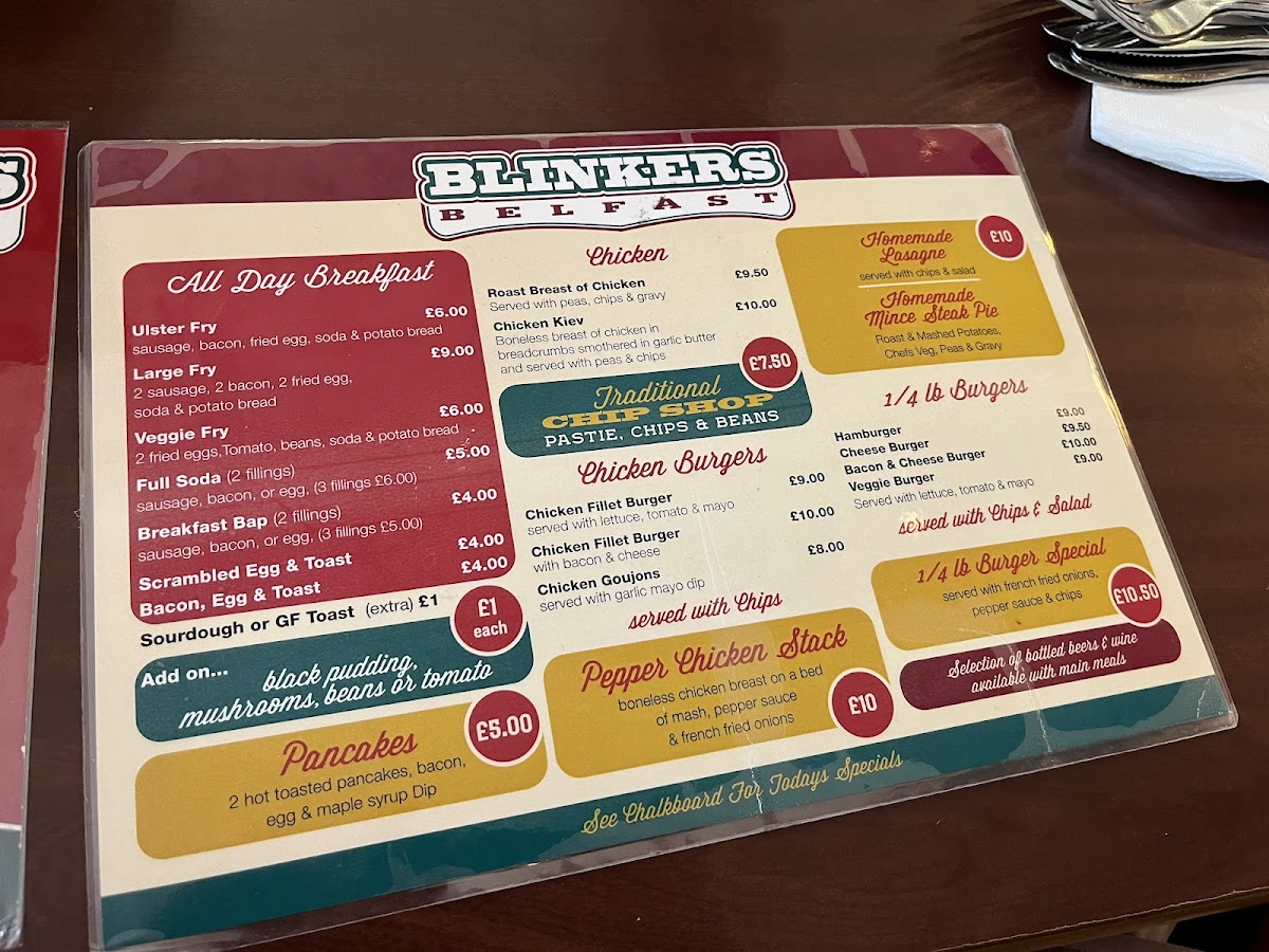 At Blinkers, the breakfast selection is a standout, particularly the iconic Ulster Fry, praised for its hearty portions and flavorful ingredients, including homemade potato bread. Customers rave about the full soda sandwiches, with reviews highlighting exceptional taste and generous servings.